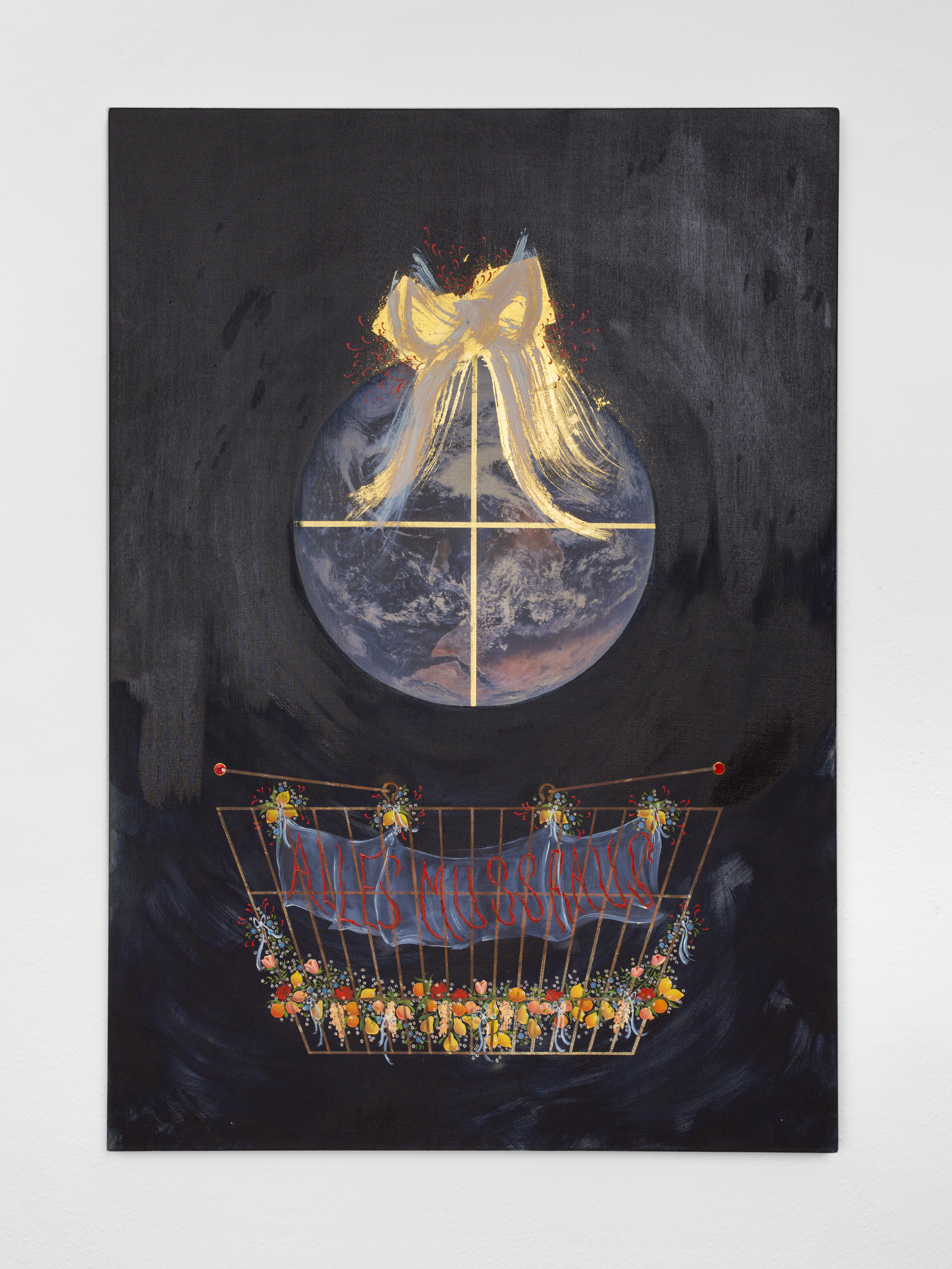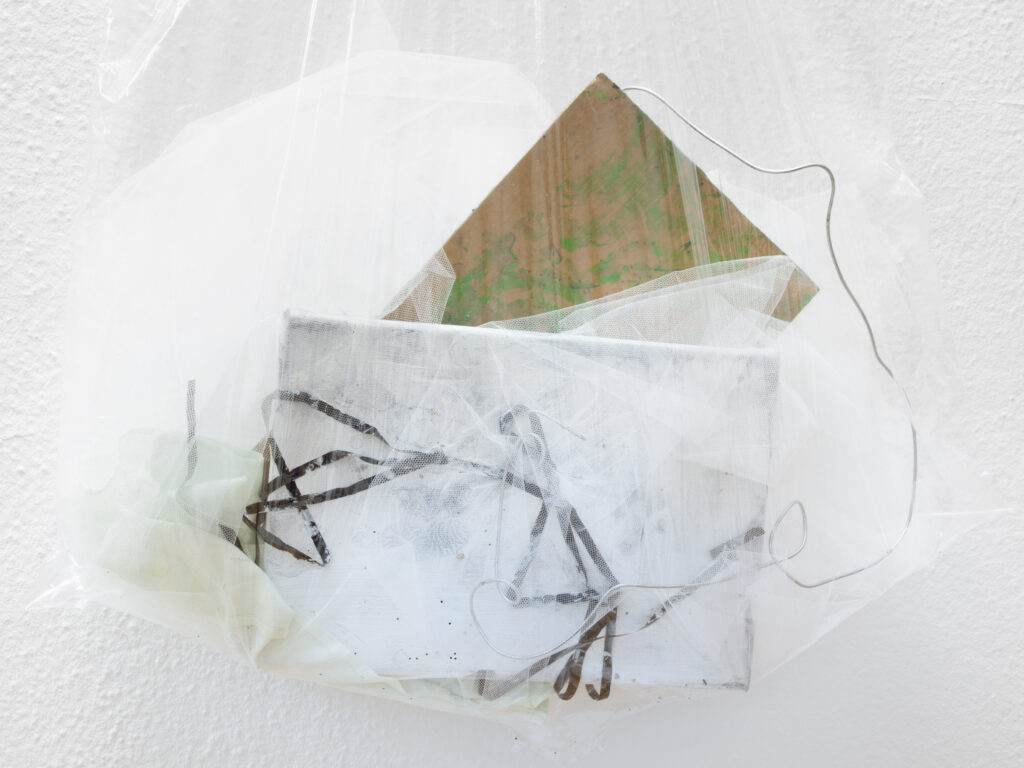 Oil, acrylic and glitter on linen, cardboard, wire and plastic, 100 x 50 cm