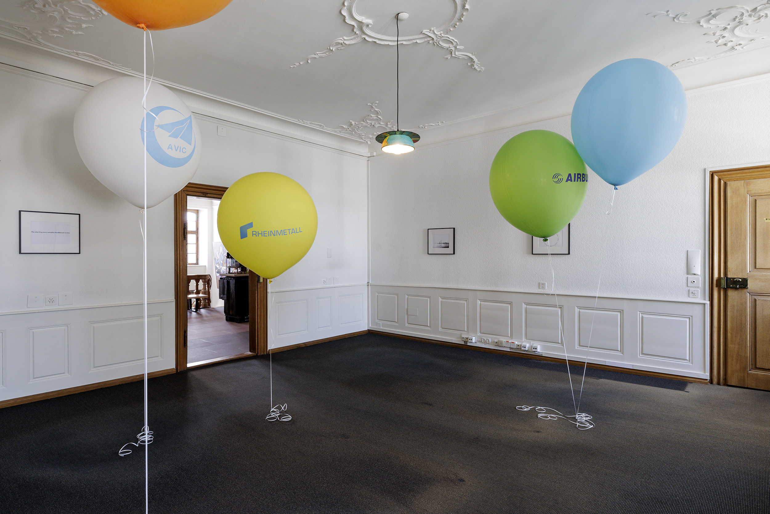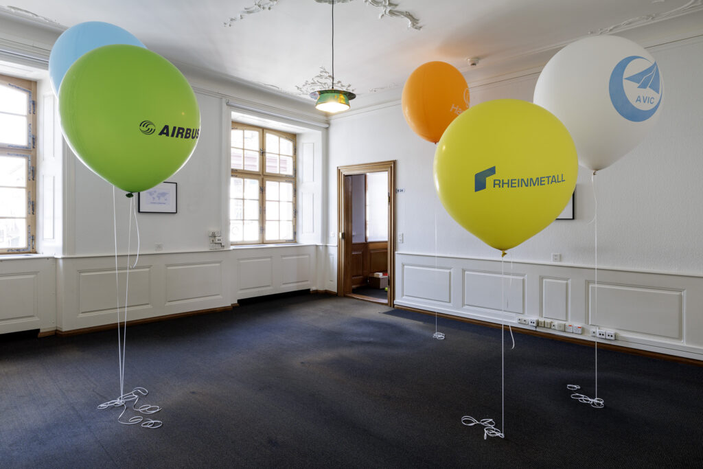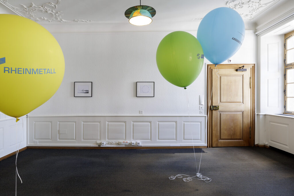 In her new series Stocks Go Boom (2025), Georgie Nettell presents a balloon installation alongside a new series of drawings. The installation features balloons printed with the names of major global arms manufacturers: Rheinmetall, AVIC, Lockheed Martin, Airbus, and Hanwha, etc., while the drawings carry a wry sense of irony in phrases such as Recession Story, The Rising Yen and The Setting Dollar, Balance Is a Complex Thing, and The Only Thing More Valuable Than Bitcoin Is Time. With these works, Nettell playfully draws attention to a darker reality—the ballooning profits in a world shaped by war and political instability—offering a critique of the inflated gains of arms manufacturers amid ongoing global conflict, where violence drives economic profit at tremendous human cost.