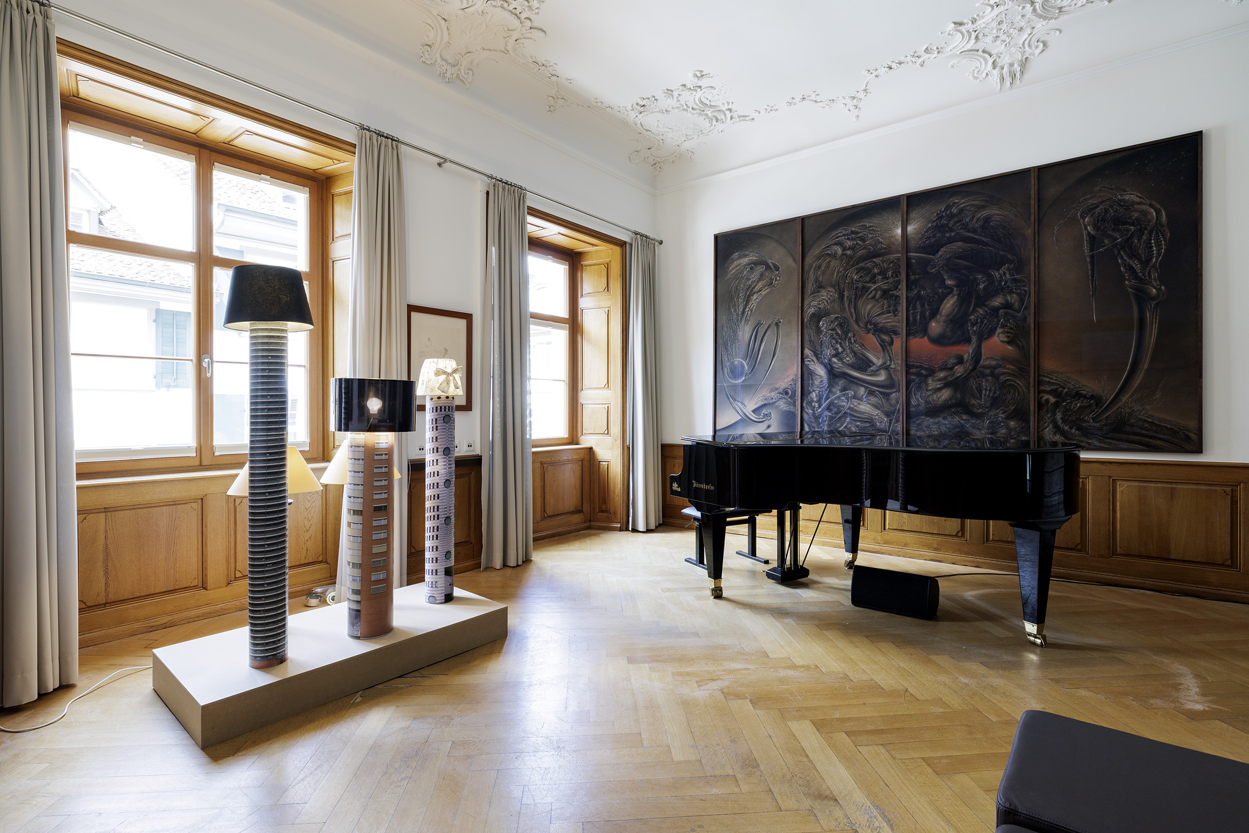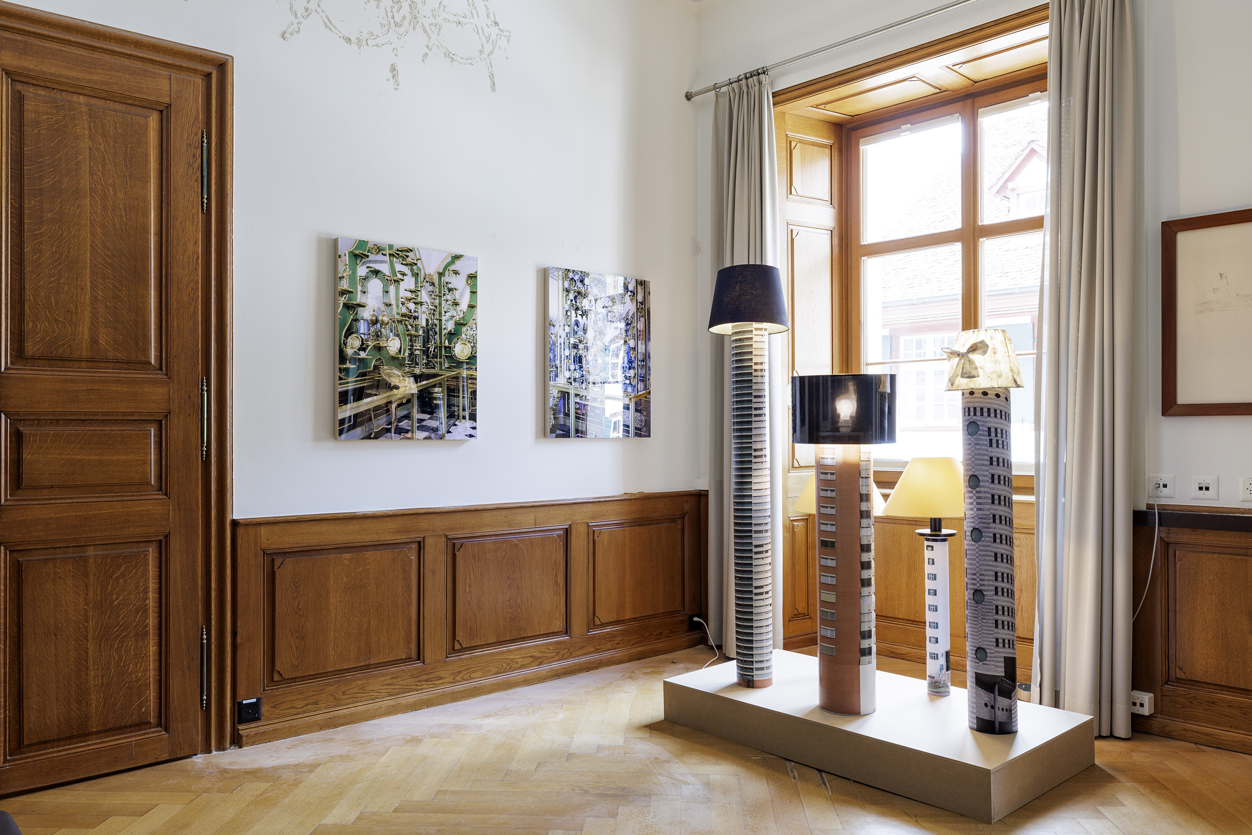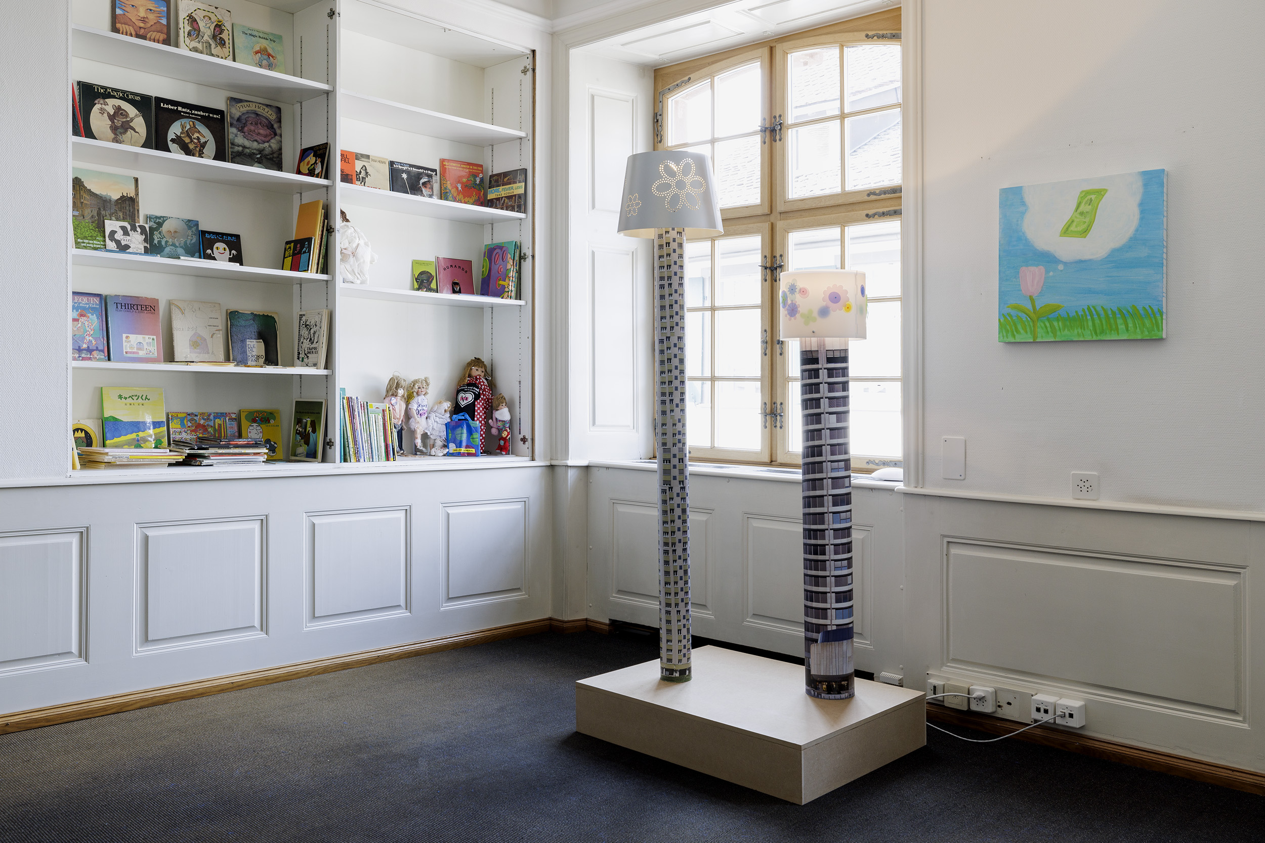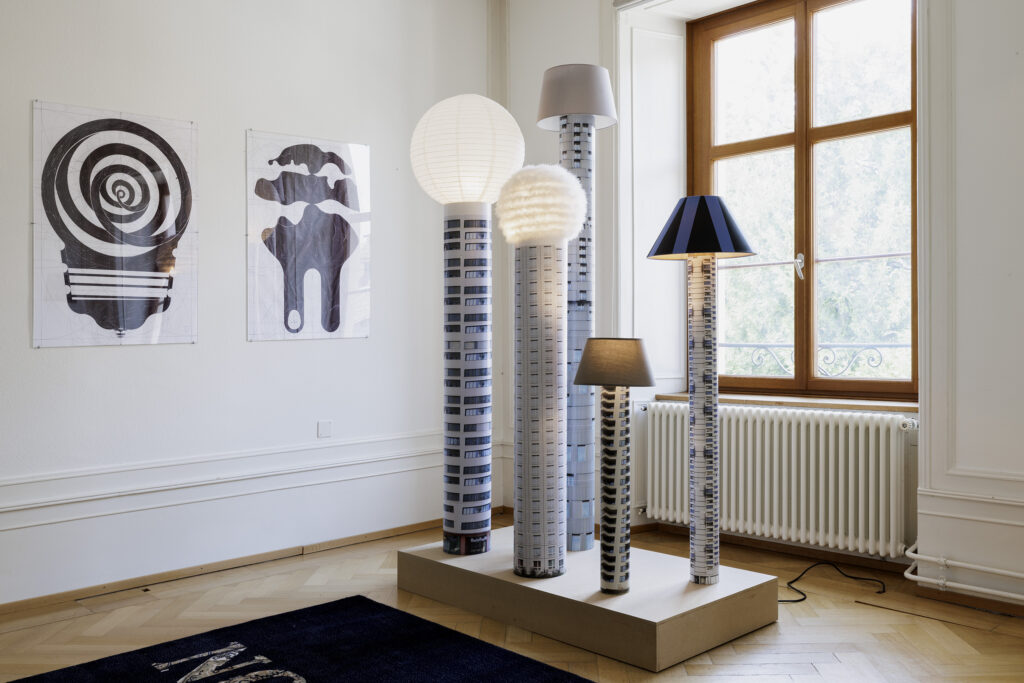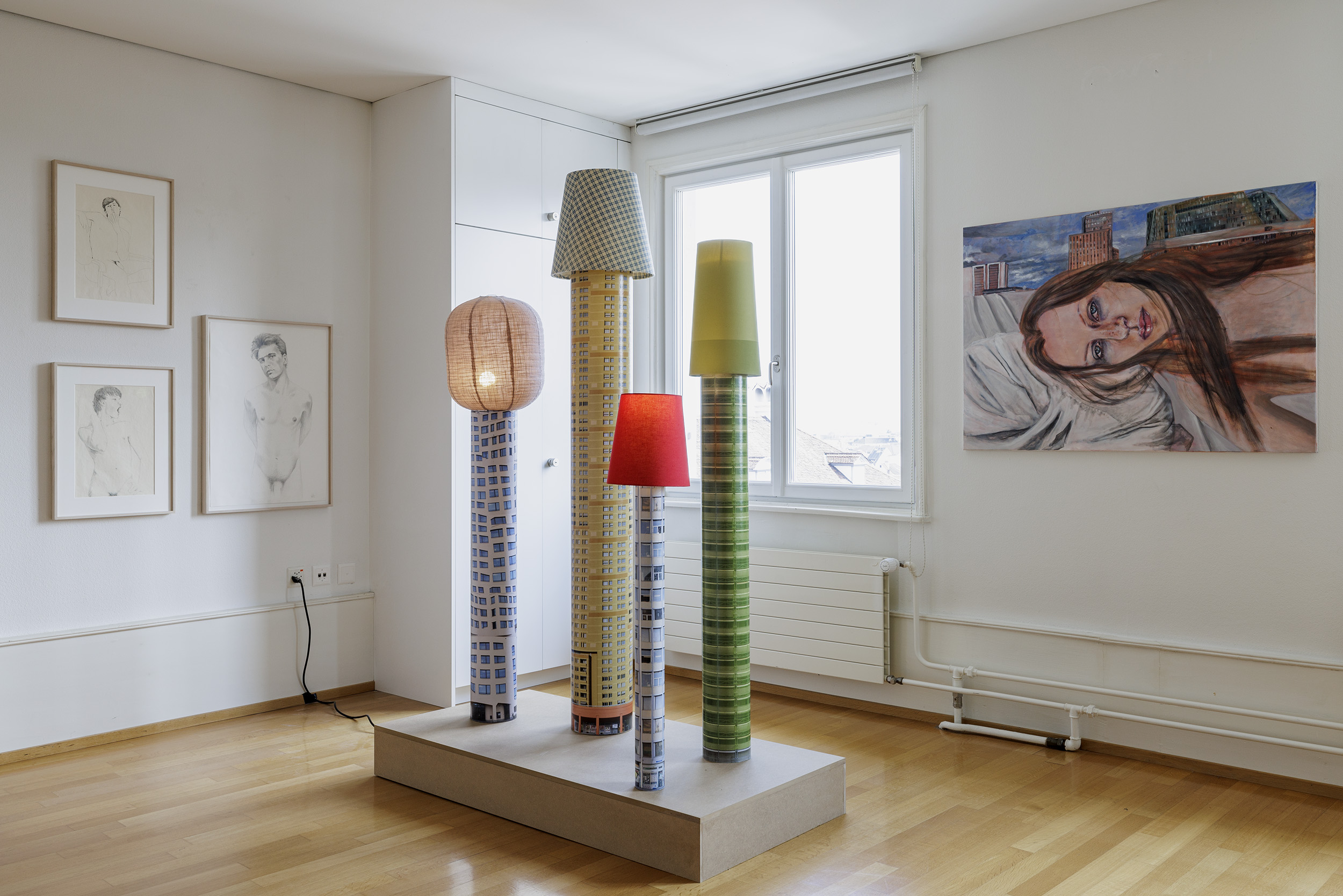 In her ongoing series High Rise (2021–), Mia Sanchez looks at life inside high-rise buildings by exploring the class dynamics embedded in this type of architecture. She reflects on how our built surroundings shape behavior, emotions, and moral choices. For Basel Social Club, Sanchez presents freestanding, lamp-like sculptures arranged in groups to resemble a city skyline. Made from cardboard tubes wrapped in digital collages of existing high-rise facades and topped with lampshades, each sculpture feels like its own character, occupying the space between public and private life. Through this assemblage, Sanchez blurs the line between fiction and reality, reflecting on the psychological impact of architecture as both a place of shelter and a structure of control.